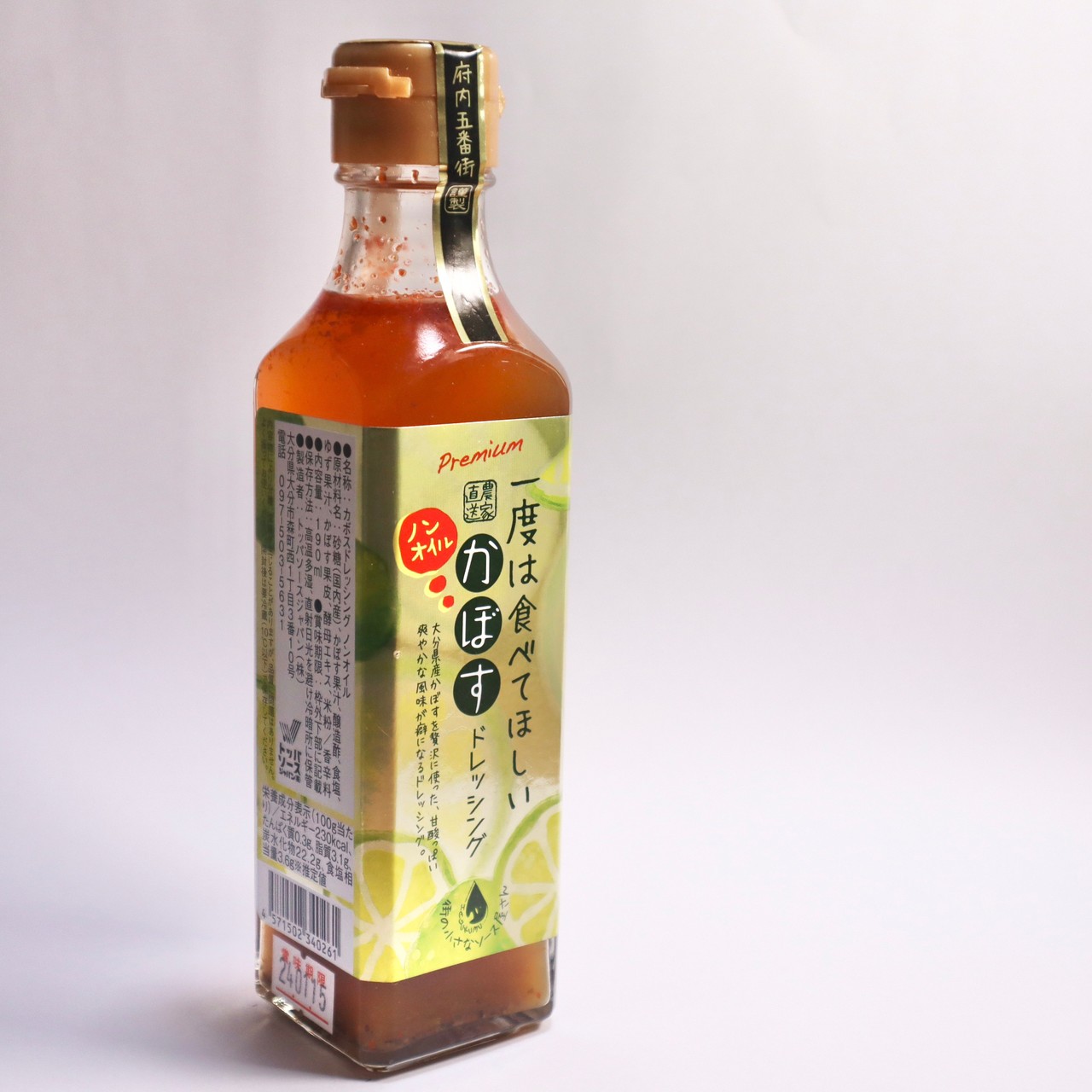 【容量:190ml、原料:砂糖(国内産)、かぼす果汁、醸造酢、食塩、ゆず果汁、かぼす果皮、酵母エキス、米粉/香辛料】
